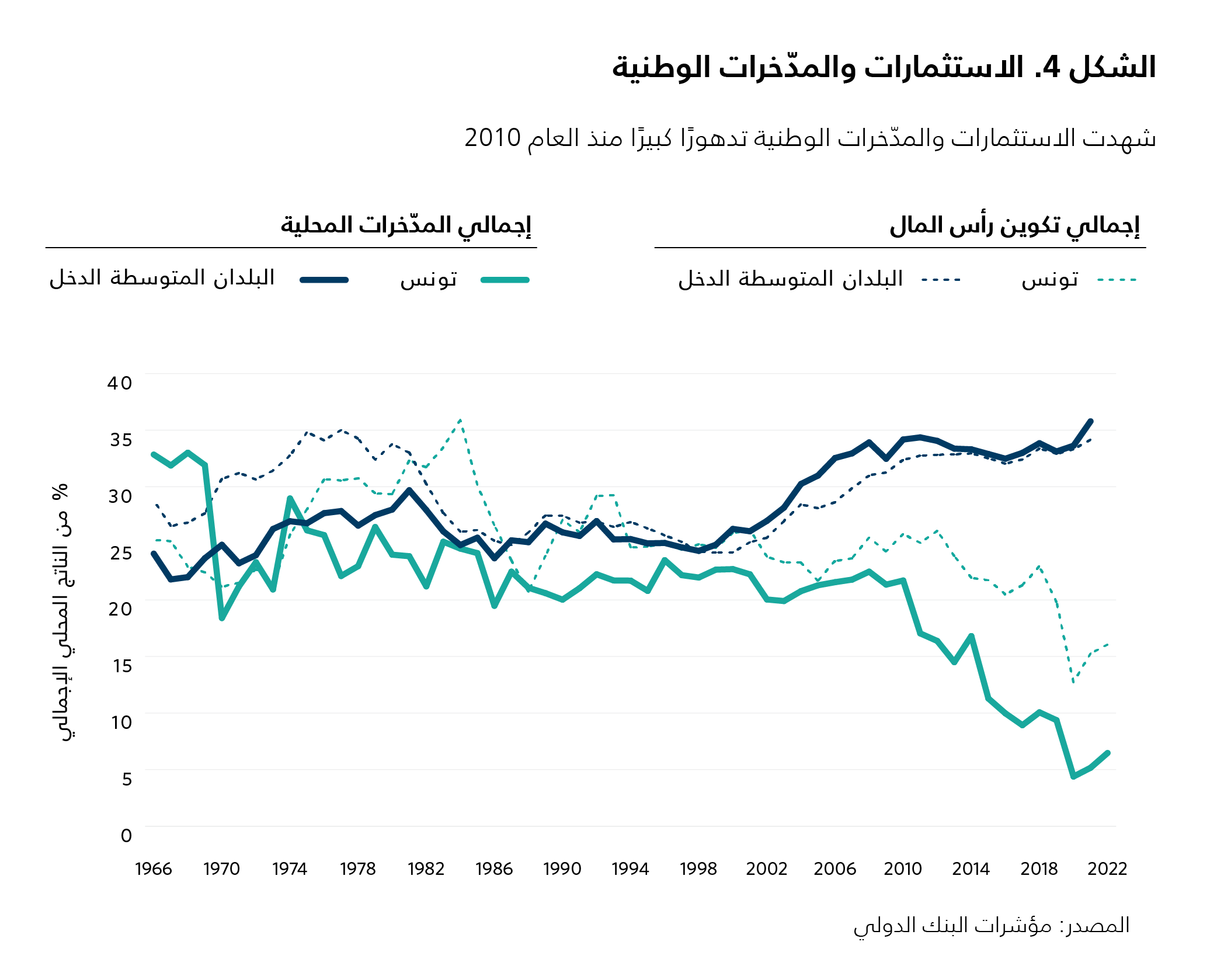 تزامن الانخفاض الحاد في النمو مع هبوطٍ سريع في الاستثمارات الخاصة والمدّخرات الوطنية. فقد سجّلت نسبة الاستثمارات إلى الناتج المحلي الإجمالي مستويات متدنّية تاريخية، إذ تراجعت من 25 في المئة من الناتج المحلي الإجمالي في بداية العقد الأول من القرن الحادي والعشرين إلى أقل من 10 في المئة راهنًا (انظر الشكل 4). وبين العامَين 2022 و2023، واصلت فئات الاستثمار كافة مسارها التنازلي. وبلغ حجم الاستثمارات الأجنبية المباشرة 0.8 في المئة من الناتج المحلي الإجمالي خلال النصف الأول من العام 2023، مقارنةً مع 2 في المئة في العام 2012، ومع متوسط بلغ 4 في المئة خلال العقد الأول من القرن الحادي والعشرين. وترافق هذا الانخفاض الحادّ في الاستثمارات الأجنبية المباشرة مع تراجع الاستثمارات المحلية، والذي يرتبط ارتباطًا وثيقًا بتقلُّص المدّخرات. ويُعزى سبب ذلك بدوره إلى العجوزات الكبيرة في المالية العامة وإلى انخفاض مدّخرات الأُسر بسبب تدنّي مداخيل الطبقة الوسطى.