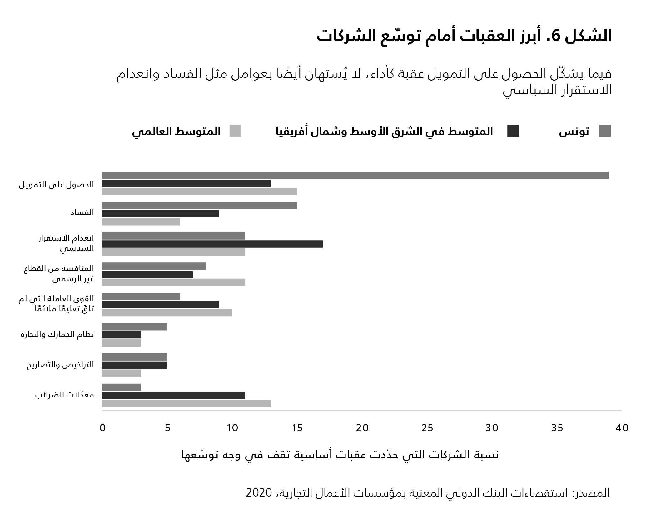 تحتاج البلاد إلى إجراء إصلاحاتٍ من شأنها تعزيز التنافسية وسيادة القانون وبيئة الأعمال بهدف بثّ الروح الدينامية في القطاع الخاص. فقطاع الأعمال في تونس خاضعٌ لهيمنة احتكارات ضخمة من القطاعَين العام والخاص، إضافةً إلى عددٍ كبيرٍ من الشركات الصغيرة غير الرسمية. ويفتقر الاقتصاد التونسي بشدّة إلى الشركات المتوسطة الحجم - التي تُعتبر في الكثير من الأحيان الأكثر ديناميةً في توفير فرص العمل حول العالم - بسبب التنافس غير العادل من القطاع غير الرسمي وأيضًا من الشركات المهيمنة التي تتمتّع بامتيازات. ويبرز هذا التباين من خلال توزيع الشركات في القطاع الخاص وفق حجمها، إذ إن 86 في المئة من الشركات التونسية كافة تُصنَّف ضمن فئة شركات الشخص الواحد. وفي الوقت نفسه، لا تمثّل الشركات الكبرى، التي يتجاوز عدد موظفيها مئة ألف شخص، سوى 0.4 في المئة من إجمالي عدد الشركات، لكنها توفّر أكثر من ثلث إجمالي الوظائف، ما يعادل حصة الوظائف في القطاع غير الرسمي. وتُعدّندرة الشركات المتوسطة الحجم السبب الأساسي خلف تدنّي مستوى الابتكار الاقتصادي.